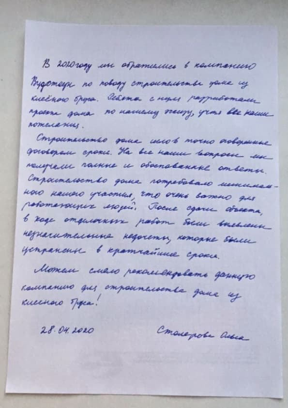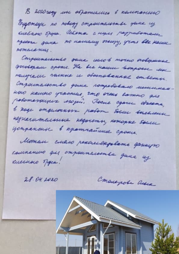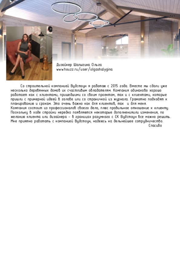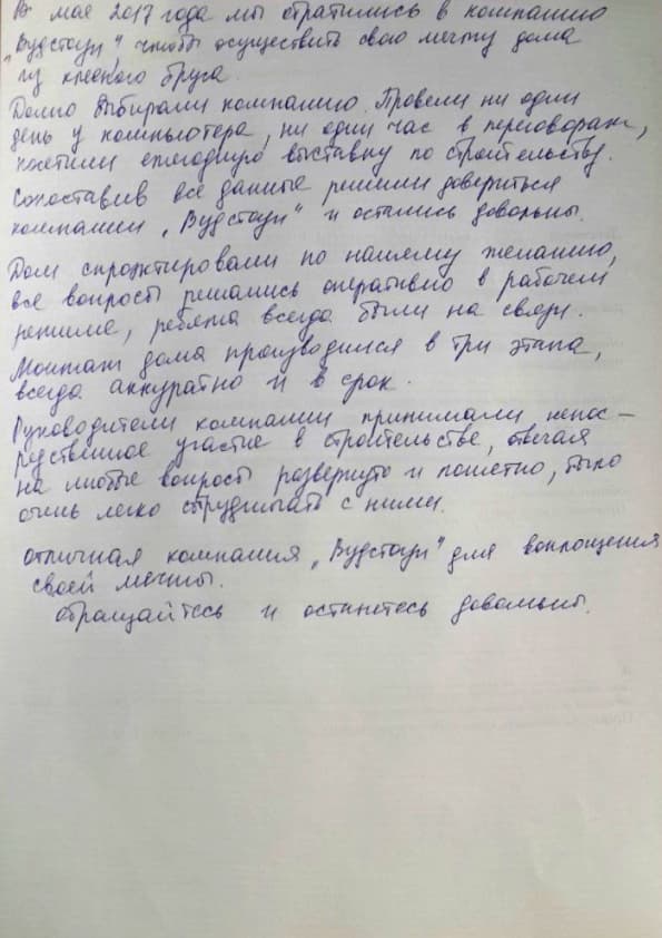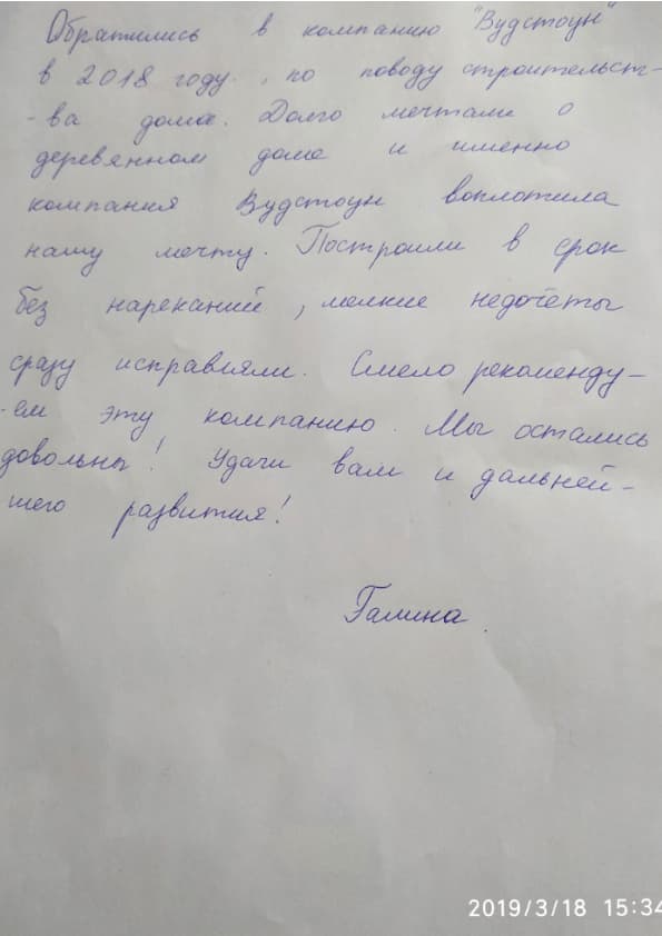 «Замечательная строительная фирма. Рекомендую от всей души. Долго выбирали застройщика загородных домов, всё нам было не так, но узнали о Вудстоун. Ребята приехали на участок, всё измерили, составили смету, были максимально честны и открыты, банк одобрил заявку и мы начали стройку...»